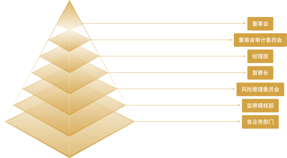 分级实施是指对风险管理工作实行分级管理,具体由董事会、董事会风险控制与审计委员会、经理层、督察长、风险管理委员会、监察稽核部及各业务部门负责实施。